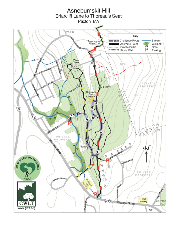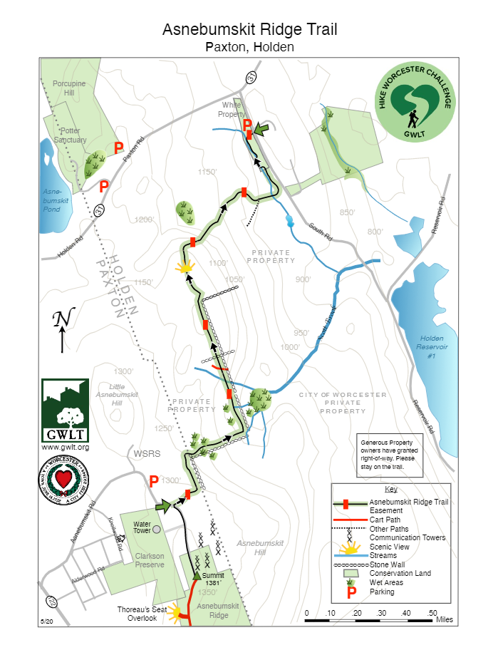 Near the summit of Asnebumskit Ridge is a scenic overlook, Thoreau’s Seat, that offers a wonderful view of the valley to the West including Mount Wachusett and Kettle Brook Reservoir #4. Along the trail are streams to cross and a formerly logged area with fields of wildflowers.