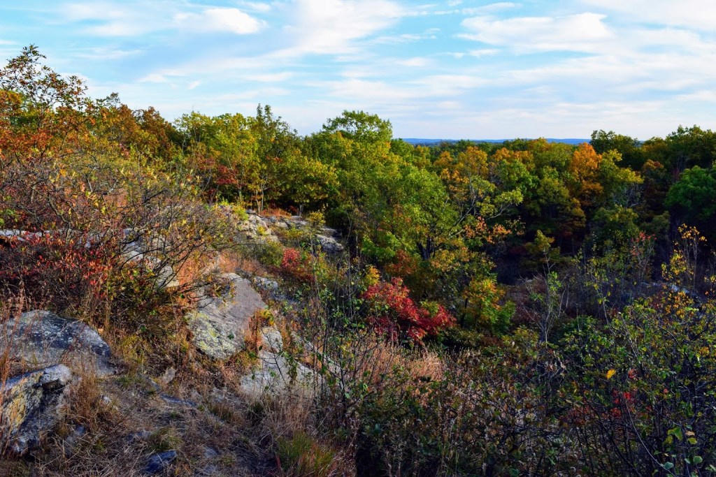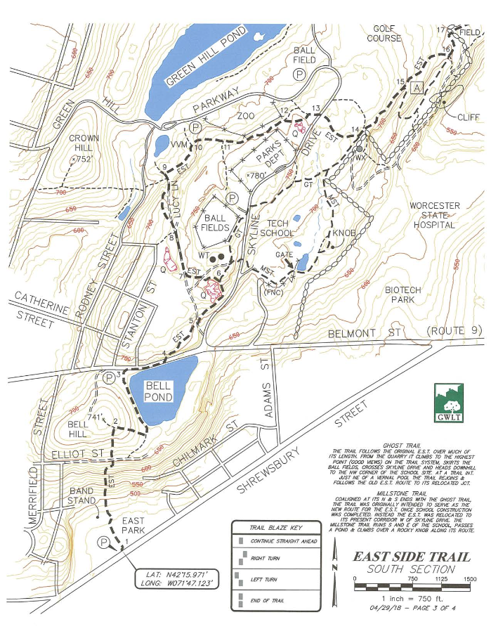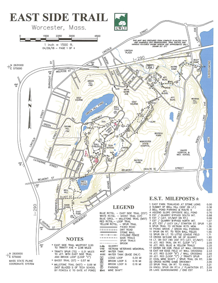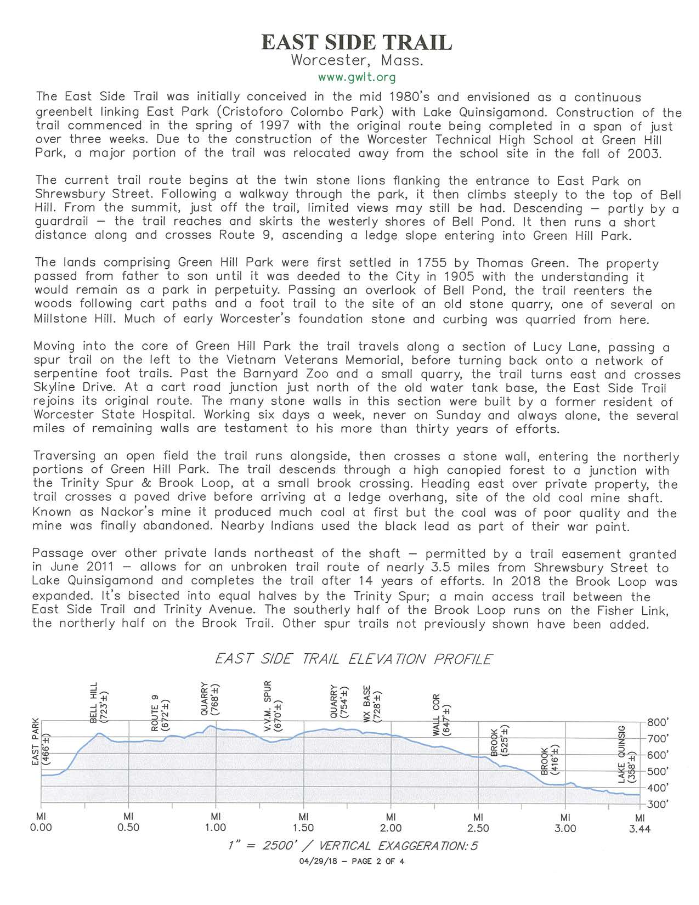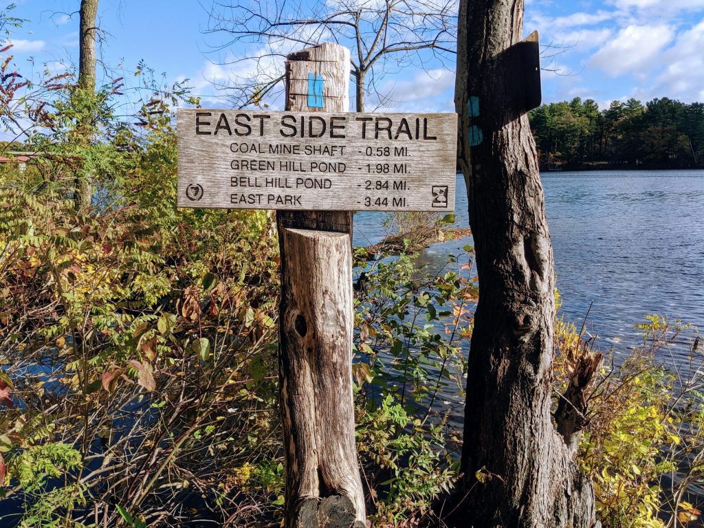 The East Side Trail is a green belt that extends from Cristoforo Columbo Park on Shrewsbury Street to Lake Quinsigamond. The trail covers 3.44 miles (one way) and is marked with blue blazes. It passes through Bell Pond, Green Hill Park, and Coal Mine Brook. Highlights along the way include an old stone quarry in Green Hill Park and the dramatic Coal Mine Shaft.