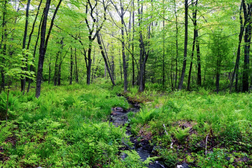 The main trail takes you near wetlands, winds through the woods, and follows a stream.