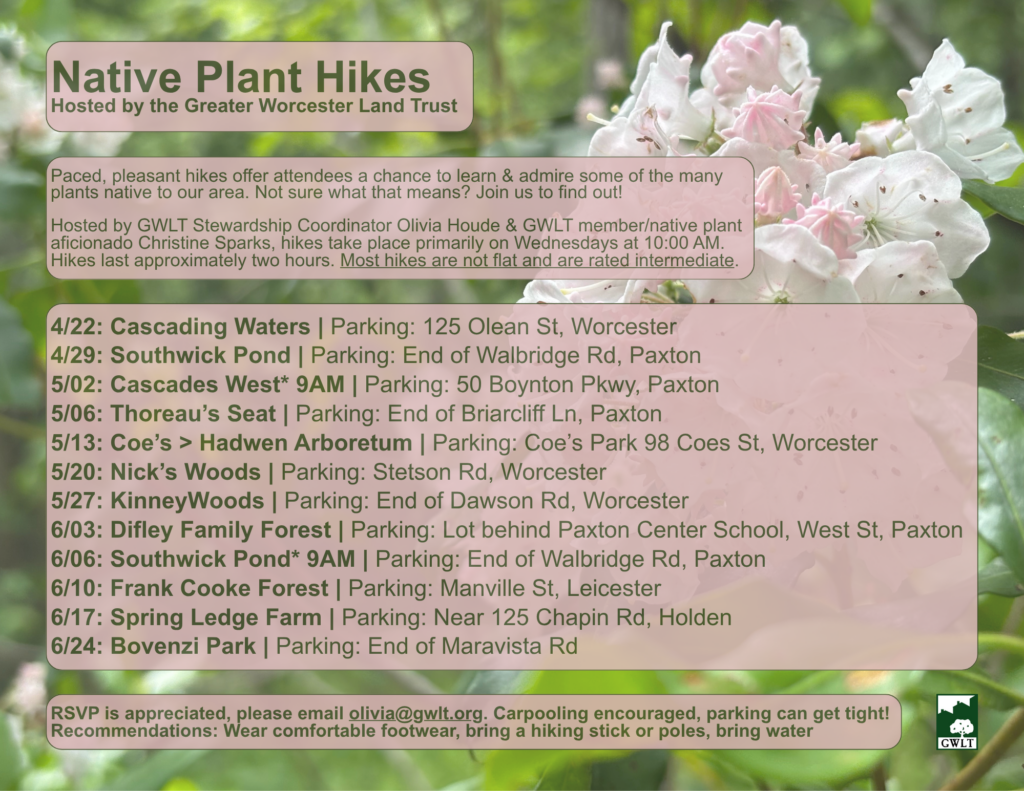 Hosted by GWLT Stewardship Coordinator Olivia Houde & GWLT member / native plant aficionado Christine Sparks, hikes take place primarily on Wednesdays at 10:00 AM. Hikes last approximately two hours.