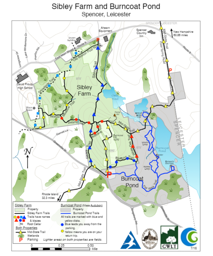Parking: Access and parking in NE at Agricultural Gate off Rt. 9; in SW at Mass Audubon’s Burncoat Pond parking area; in W on Greenville Street at water tower gate