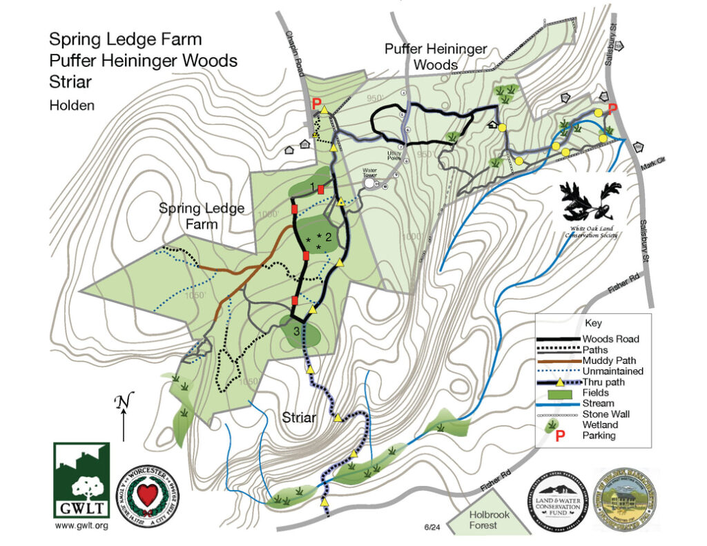 Spring Ledge Farm is presently held by the Holden Conservation Commission for wildlife habitat and passive recreation purposes, with a conservation restriction held by the City of Worcester Reservoir Division and the Greater Worcester Land Trust. Property access is off of Chapin Road at the break in the stone wall on the east side of the street with parking in the pine grove. ​